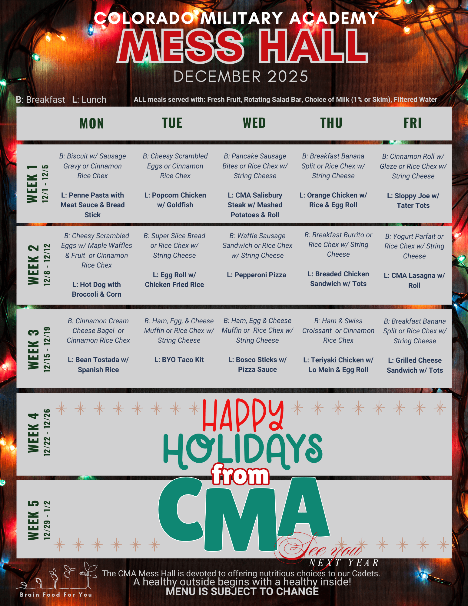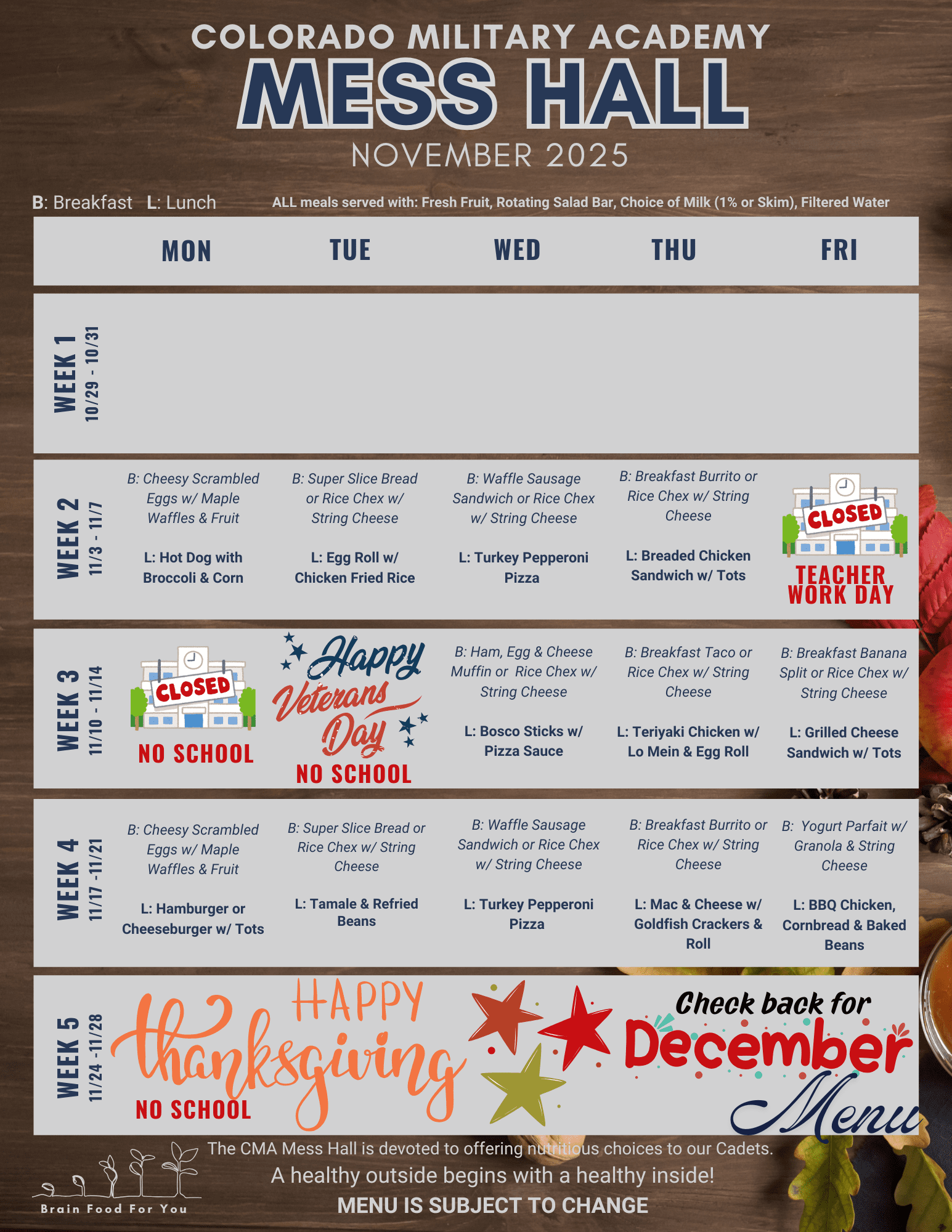 At Colorado Military Academy, we are committed to nurturing both the minds and bodies of our students. Our Food and Nutrition program is designed to provide balanced, healthy meals that fuel our students for success throughout the day.
